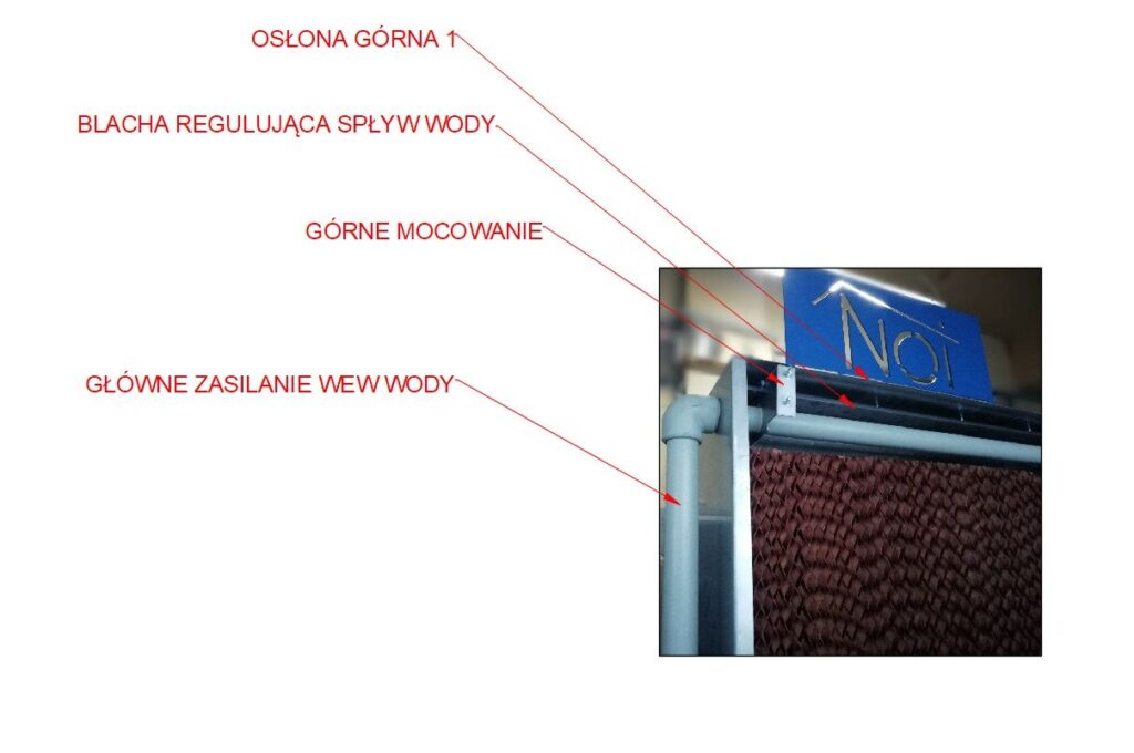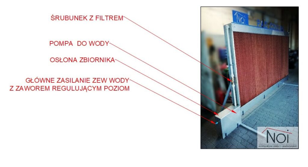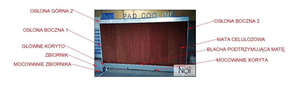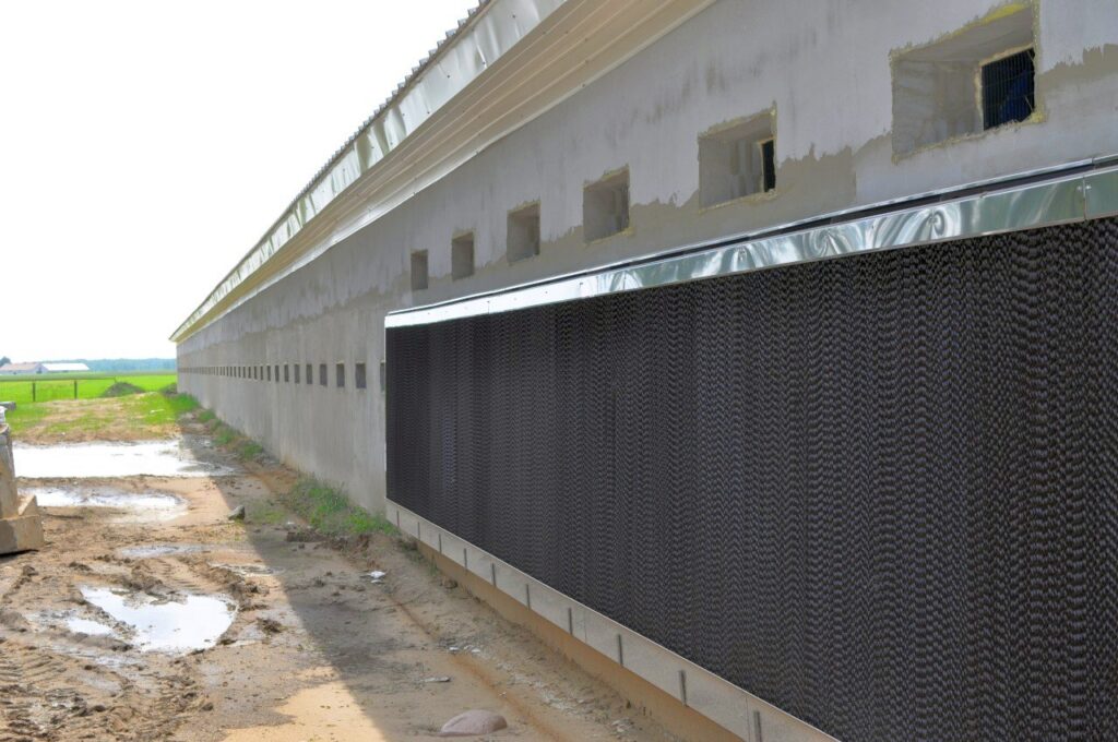 Obieg wody pod wpływem grawitacji tworzy się w panelach o strukturze plastra miodu, wykonanych z celulozy. Instaluje się go z boku budynku inwentarskiego. Na scianie frontowej montowane są wentylatory które zasysają powietrze przechodzące przez maty chłodzące. Napływające powietrze jest chłodzone i nawilżane.